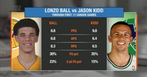 Il est vrai que les statistiques sont assez frappantes. Après 11 matchs joués dans leur carrière respective, Lonzo Ball et Jason Kidd sont numériquement parlant similaires ou presque. Mêmes difficultés au shoot, mais même appétit pour la passe et le rebond, la comparaison réalisée par ESPN dans son show First Take est sans équivoque.