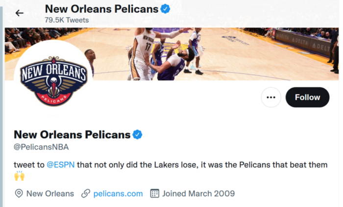 Pour mieux comprendre, il faut basculer du côté de Twitter, où le CM des Pelicans est visiblement assez taquin. Peu après la défaite, ce dernier a décidé de changer la bio du compte, pour mettre en avant la victoire sur les Lakers. C’est ESPN qui en prend pour son grade, avec ce nouvel avertissement.