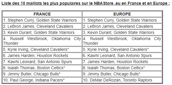 Pour ce qui est des ventes par équipes, les Warriors restent premiers, talonnés par les Cleveland Cavaliers. Grosse surprise car le marché Chicago vend toujours (3ème) ainsi que les Lakers (4ème) malgré leurs saisons catastrophiques. Le Thunder d’Oklahoma City se place 5ème sur les ventes de marchandises par équipe en France, sinon les traditionnels Knicks sont cinquièmes sur le continent européen.