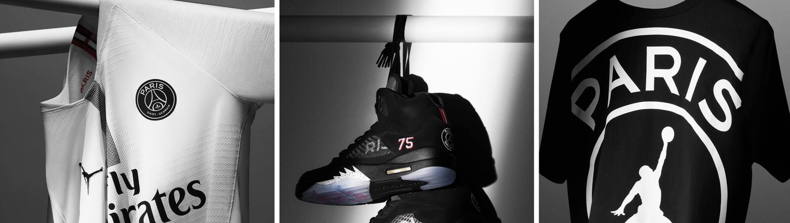 Le maillot blanc, les sneaker et un t-shirt noir issus de la collection Jordan x PSG.