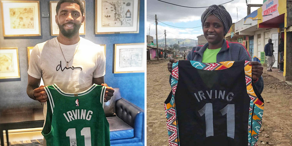 Le concept ? Vendre aux enchères un maillot dédicacé par le joueur, puis lancer la conception et la production (par des Kenyans), suivies de la commercialisation, d’un modèle customisé aux couleurs de l’athlète. Mariam Naipanoi, dessinatrice du jersey kenyan de Kyrie Irving, raconte :